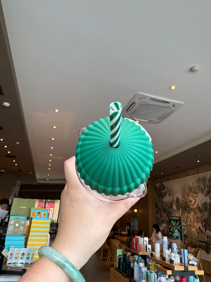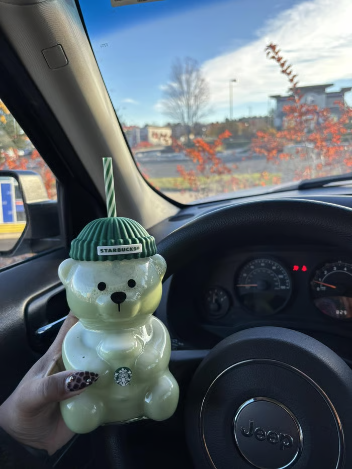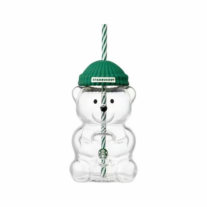 Design: Transparent bear-shaped glass with a Starbucks green cap and straw—featuring Starbucks beanie.
